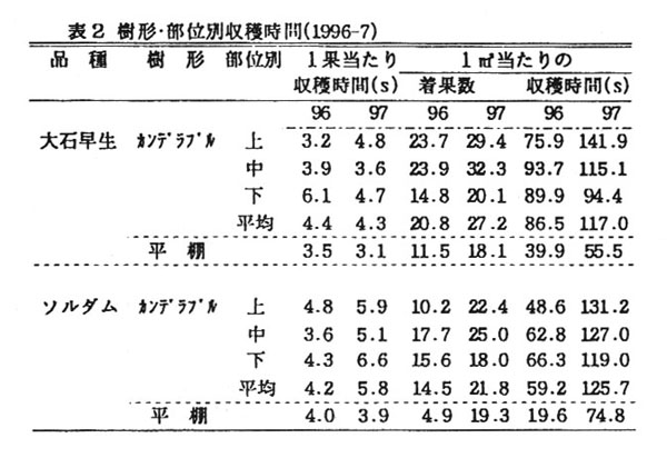 一果当たりの収穫時間は、カンデラブル樹形が平棚より多く、部位では、上部、下部で収穫時間が多くかかる(
