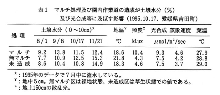 - 多孔質シートをマルチ処理してシート下に潅水すると土壌水分か高く維持される。また、地表面温度や、地中温度も低下し、樹冠内照度は1.5mの高さまでも明るくなり、光合成能か2割以上高くなる(表1)。