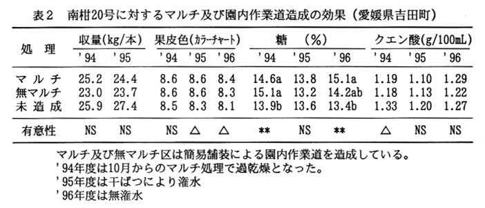 - 南柑20号の傾斜地園(傾斜度約25°)では、園内作業道を造成し、多孔質シート(白色)を梅雨明け後、樹冠下程度に簡易マルチすることで、果皮の赤みか強く、糖度か高く、クエン酸は適当な果実か生産される。また、園内作業道を造成するだけでも高品質果になる。なお、収量的には三者間で差がない(表2)。