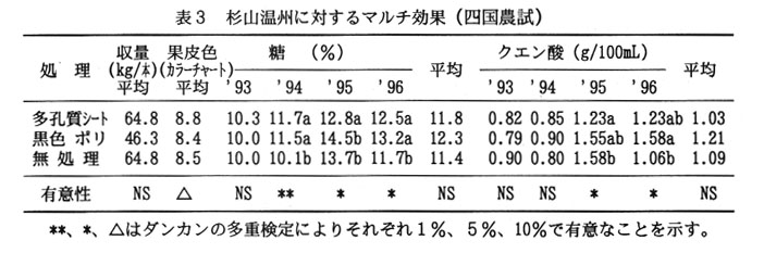 - 杉山温州の傾斜地園(傾斜度約25°)において、多孔質シート(白色)を簡易マルチすると、収量か安定し着色か良く糖度は高めで、クエン酸は低い果実か生産される。しかし、マルチ資材に黒色ポリフィルムを使った場合、2年目の収量が減少し(樹勢か衰弱化)、着色か劣り、糖度は高いがクエン酸も高くなる(表3)。