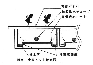 ベッドは地上約1mに水平に設置し、ベッド内は培養液が滞留しないように排水溝を設ける。ベッド。内に細霧灌水チューブを設置し、噴霧による給液を行い、余剰液はタンクに戻る循環式である。給液は連続及び間断給液が行えるようタイマーで制御する。間断給液を行う場合には、給液ポンプと連動する廃液口バルブが開閉する(