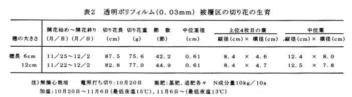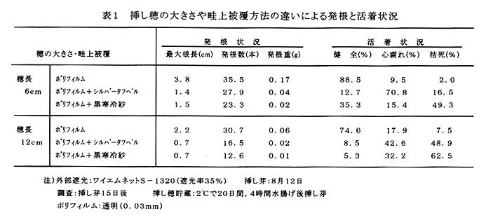 慣行のきく栽培では、挿し芽育苗や定植作業に多大な労力を必要とし、生産性向上や規模拡大の大きなネックとなっている。そうした中で、省力栽培の一手段として挿し穂を直接定植する直挿し栽培の試行が見られるが、技術的には未確立である。特に夏期の高温期については、技術的に難しさが想 定される。そこで、高温期の直挿しにおける挿し穂の大きさや被覆方法について検討し、その技術確立を図る。