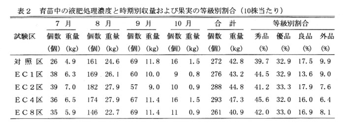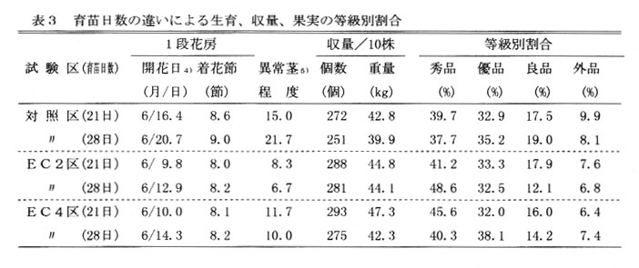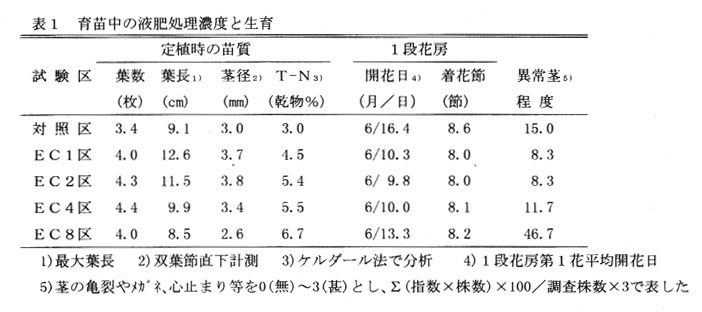 トマトのセル苗を直接木圃に定植することにより、鉢上げや育苗管理が省略でき、定植時の作業負担も軽減されるが、草勢が強く過繁茂となり、異常茎の発生や果実品質の低下が問題となる。 そこで、セルトレイでの育苗期間中に高濃度の液肥を灌水代わりに施用することにより、生育の安定と品質の向上を図る。