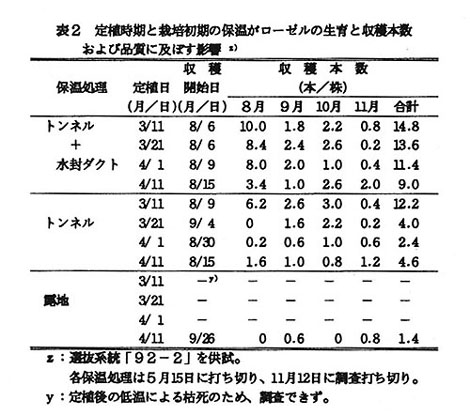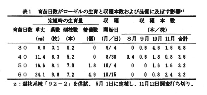 ローゼルは、アフリカに自生するアオイ科の一年草で比較的乾燥条件には強いが、耐寒性が弱いことが知られている。高知県では通称「ベニアオイ」と呼ばれ、紅色の発達したがくと小包片を着けた枝物として夏~初冬に一部生産・出荷されている。ところが、本種の栽培法については十分明らかでなく、栽培技術の確立が望まれている。そこで、西南暖地の平坦部で、夏~初冬に技物として安定生産できる栽培技術を確立する。
