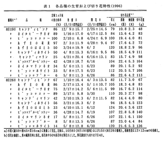 中山間地域のトルコギキョウの夏出し栽培は、気象災害や病害虫の被害を受けやすく、さらに低価格時の出荷となるため、四国内では産地化が進んでいない。そこで、平坦部の1~3月出し栽培の生産が終了する時期と、四国外冷涼産地の出荷が始まる時期の端境期にあたる4~5月出し作型について、普通育苗苗利用での品種選定および栽培技術を確立する。