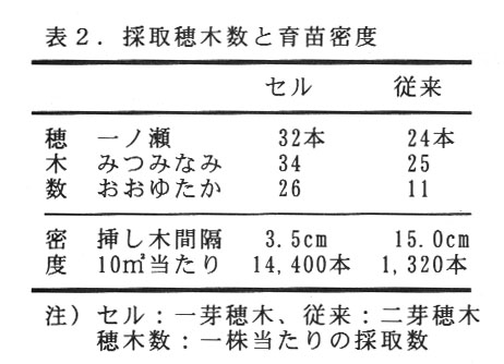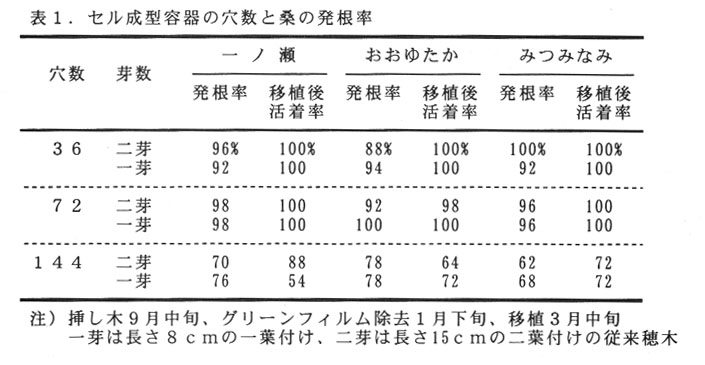 従来の新梢挿し木法は、5月に育苗圃場に新梢の穂木を直接挿し木をし、翌春に成苗を 植え付けるが、ここでは、優良桑品種の苗を大量で安定的にしかも省力的に自給するため、晩秋蚕期の残桑である春切桑園中伐後の再発枝が利用できる9月中旬にセル成型容器を用いて挿し木をし、更に、翌春この稚苗を機械で本圃に移植する方法について検討した。