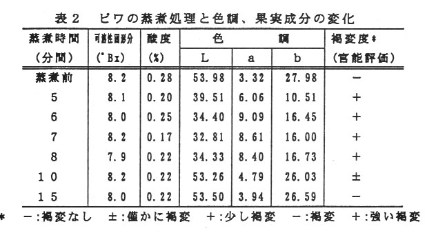 ビワの調理時の褐変は、10~15分間蒸煮することで防止できる。蒸煮・調理した果肉に砂糖を40%、ビタミンCを0.2%添加して冷凍貯蔵することで、食品素材として通年利用ができる(