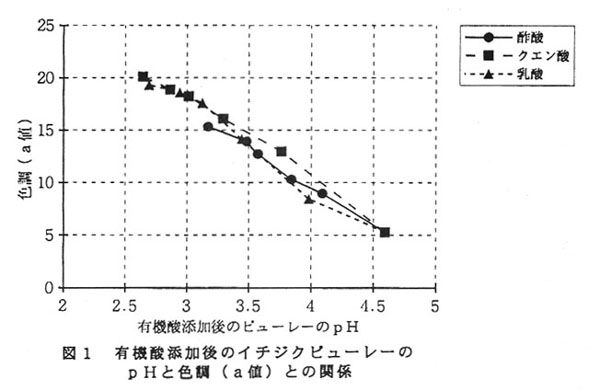 イチジクは、剥皮後ピューレーとして冷凍貯蔵することで、果肉の色調を生かした食品素材として通年利用がでる。イチジクの果肉の色素は、アントシアン色素でピューレーの色調は添加する有機酸の種類にかかわらずpHに依存して変化し、pHが低くなるほど赤色が強くなる(