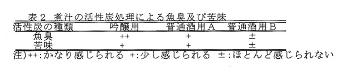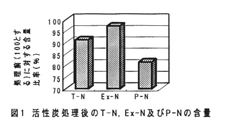 - 煮汁を普通酒用活性炭で処理することで魚臭及び苦味を低減できる(表2)。また、普通酒用活性炭処理によって除去される窒素成分は主にタンパク態窒素(P-N)であり、工キス窒素(Ex-N)はほとんど変化しない(図1)。