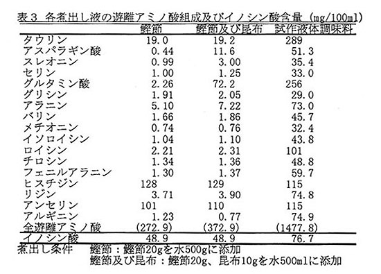 - 試作調味料(Brix9.4)は市販鰹節の煮出し液に比べ、グルタミン酸では3.5~100倍、イノシン酸では約2倍含量が高い(表3)。