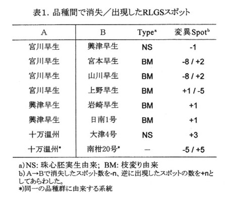 )。枝変わりと珠心胚実生に由来する品種間でRLGSスポットのパターンを比較したところ各品種間で出現もしくは消失するスポットが見出された(