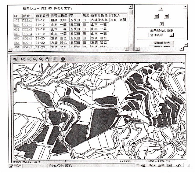 本システムでは地図上の指定範囲による土地条件(地番、農家番号、世帯主氏名、字、現況、所有者氏名)の集計、さらに土地条件(字、所有者氏名、現況)の組み合わせによるデータベース検索および該当する土地の地図表示を行うことが可能である。例えば、住所が「五反田」で土地利用が「田」の全てレコードを検索・表示した結果を図として示した。地図上でハイライトされた部分が該当する全区画である。