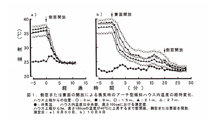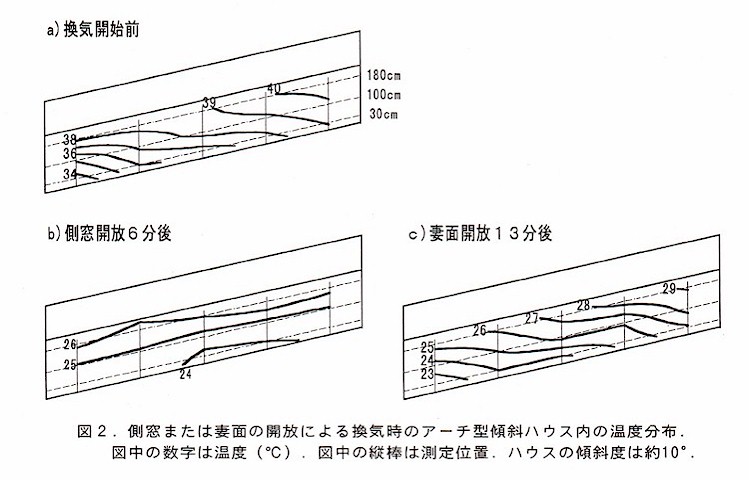 アーチ型傾斜ハウスは,側窓または妻面を開放することにより換気され,速やかに外気温近くまで低下する。換気に要する時間は妻面開放より側窓開放の方が早い(