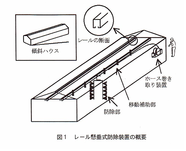 本装置は傾斜下方向の移動に重力を利用しており、傾斜角度が緩いと防除部に過大な加重が必要となるので、傾斜5度以上の傾斜ハウスの防除作業で使用する。