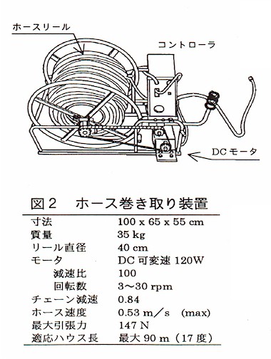 モータを選定するにあたって、ハウスの傾斜角度と傾斜方向の長さによってホース巻き上げに必要な力が変化するので、