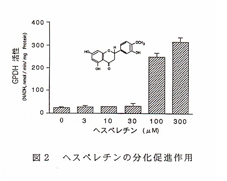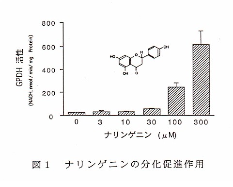 前駆脂肪細胞の脂肪細胞への分化を促進する効果のあったカンキツ抽出物中の有効成分はカンキツ特有のヘスペレチン、ナリンゲニンなどであり、脂肪細胞への分化の指標であるグリセロール-3-リン酸脱水素酵素(GPDH)活性を上昇させ分化を促進させる(