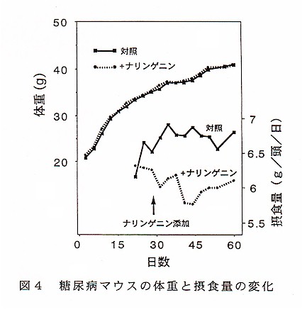 ナリンゲニンを含む餌を与えたⅡ型糖尿病マウス(KK-Ay)では血糖の低下(287.3±56.8から186.7±34.6mg/dl、有意差有り)や摂水量の低下が認められる。また、体重の変化はないにも係わらず摂食量の低下が起こり食物効率が高い(