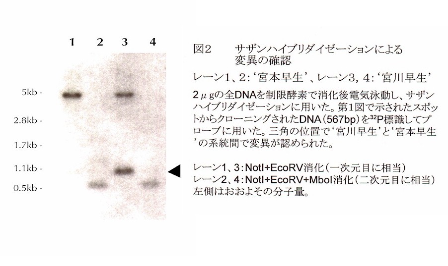 適用例として、代表的なウンシュウミカン系統である「宮川早生」と、その枝変り系統の「宮本早生」において、「宮川早生」では見出されるが「宮本早生」では見出されない遺伝子座に対応するスポット(