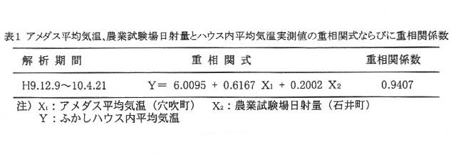 - 平均気温、日射量とふかしハウス内平均気温について重回帰分析を行うと、高い相関がある(表1)。