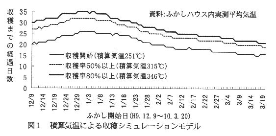 - 農家のふかしハウス内気温の実測データをふかし開始から収穫までの積算気温に当てはめると、ふかし開始時期で収穫までの経過日数が変化する収穫シミュレーションモデルが得られる(図1)。