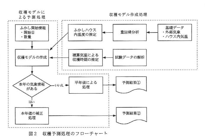 - ふかし開始情報を収穫モデルに当てはめることで収穫予測を行う。外部気象は平年値を使用するが、今年の気象データがある場合は、入力することにより本年値で補正された予測結果を得ることができる(図2)。