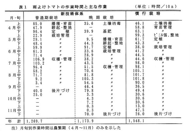 - 中山間地域の雨よけトマト作において、セル苗直接定植と7段摘心栽培を組み合わせた栽培技術体系で、慣行栽培と同等の所得を得るためには作型を組み合わせて1.3倍の作付面積が必要であるが、年間の作業時間に差はなく、軽作業化を考慮すると経営的にみて有効な技術体系である。