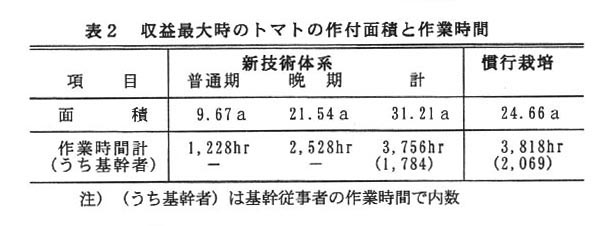 そこで、現地試験のデータをもとに、家族労働力の範囲内で収益が最大となる作型の組み合わせを求め、慣行栽培との比較により新技術体系の経営評価を行った。