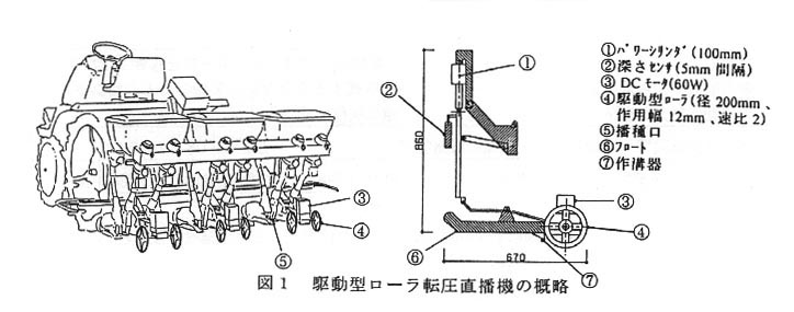 - 本機は、乗用型湛水土壌中直播機の播種部を改造利用したもので、既販機の播種部に、新たに60Wの直流モータで駆動する直径200㎜の駆動型ローラを備えたものである(図1)。