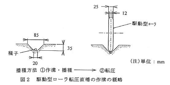 - 本機は、代かき後ほ場において、酸素供給剤被覆種子を、深さ3.5㎝の逆台形状の播種溝に播種し、さらに駆動型ローラで種子を転圧する潤土表面点播に使用する直播機である(図1)。