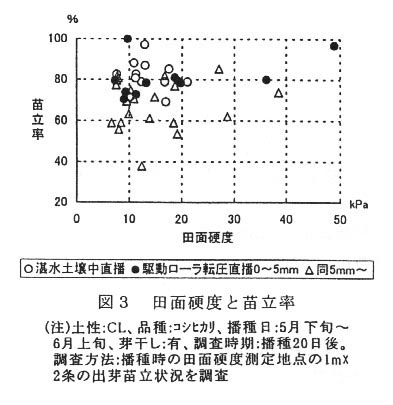 - 本機を利用した直播に適する田面硬度は10~40kPa(ゴルフボール1m落下露出高;15~30㎜、40kPaを超えると轍が残り作業性が劣る)であり、湛水土壌中直播の10kPa程度に比べてやや固めとし、播種溝が播種直後に潰れないことが重要である。