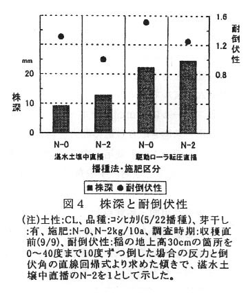 - 本機による播種時の適正田面硬度の範囲は湛水土壌中直播機よりも広く、必要笛立数を確保しやすい。また、収穫期には播種溝が埋まり稲の株深が深くなるため、耐倒伏性が向上する(図3、4)。