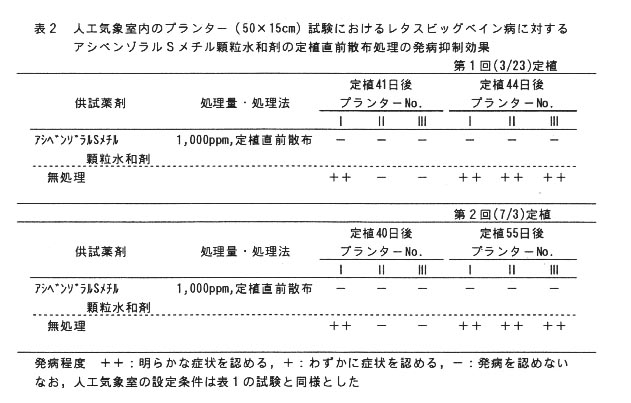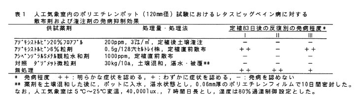 - 土壌伝染性病害であるレタスビックベイン病に対して、病害低抗性誘導化合物であるアシベンゾラルSメチル顆粒水和剤1,000ppm液の定植直前苗への散布、並びに殺菌剤であるアゾキシストロビンフロアブル剤200ppmの定植後の㎡当たり3リットル潅注が高い発病抑制効果を示す。
