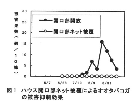 - オオタバコガに対しては、雨よけハウスのサイド部および間口などの開口部を、目合い5.lmmのネットで被覆すると、その被害の発生を防ぐことができる(図1)。