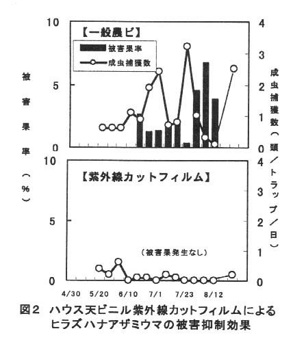 - ハウス天ビニルに紫外線カットフィルムを使用すると、ヒラズハナアザミウマによる果実被害の発生も抑制できる(図2)。