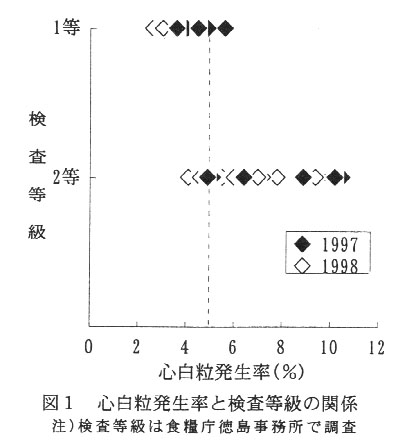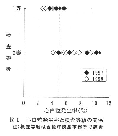 - 場内で施肥条件を変えて栽培したサンプルの2等格付け理由は全て心白粒の発生によるもので、年次によって異なるが心白粒割合5%前後が1等と2等の境界域となる(図1)。