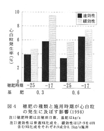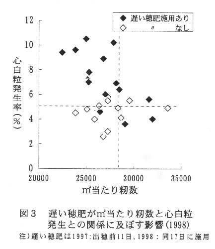 - また、1㎡当たり籾数が28,000粒よりも少ないときに遅い穂肥(出穂前17~10日)を施用すると心白粒の発生が多くなる(図3)。そして、このことは穂肥に緩効性肥料を使用した場合に顕著である(図4)。