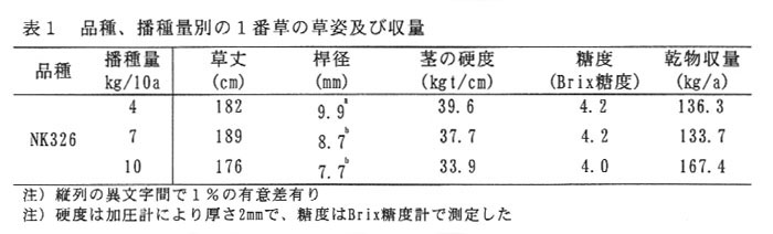 また、茎の柔らかさ、糖度、乾物収量、作業適性から有望な品種は「NK326」である。(表1)
