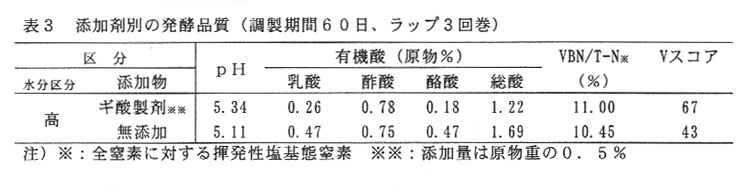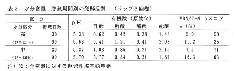 - サイレージ調製は、材料の水分を中水分(74~55%)とし、ラップ巻数を3回巻きとすると気密が保持され、90日保存でも発酵品質は低下せず、実用的である(表2)。また高水分(75%以上)では、ギ酸製剤を添加することによって酪酸発酵は抑制され、品質が向上した(表3)。