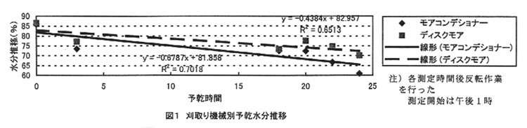 - 原料をモアコンディショナーで刈取り、3時間ごとにテッダで攪拌を行うことにより、晴天下では約20時間で水分約70%以下に予乾できる(図1)。
