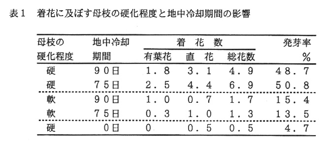 - 地中冷却を組み合わせた超促成栽培ではせん定後発芽した母枝の硬化程度がその後の花芽分化に影響を及ぼす。地中冷却期間は75~90日程度必要である(表1)。