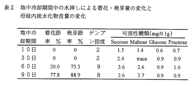 - 地中冷却60日目頃から母枝内にデンプン、マルトースか集積してくる。同時に発芽率、着花率も上昇する(表2)。