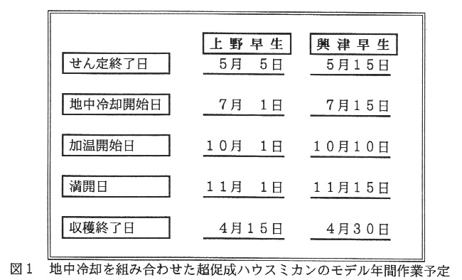 - 地中冷却を現行の栽培体系に組み入れると上野早生では5月上旬せん定、7月1日地中冷却開始、10月1日加温、4月上旬収穫が、宮川早生では5月中旬せん定、7月15日地中冷却開始、10月10日加温、4月下旬収穫が可能となる(図1)。