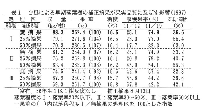 - 早期落葉樹の補正摘果は、果実の肥大効果を促進する。しかし、落葉率の大きい樹体は、小さい樹体に比べて肥大が小さく、果実の軟化も早い。また、収穫が前進することから、糖度も低くなる(表1)。