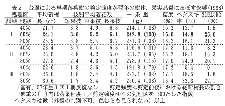 - 落葉程度が同一の場合は、剪定を強くすると着果が早期に制限されるため、果実の肥大が促進されヘタスキ果が増加する。しかし、落葉率の大きい樹体は小さい樹体に比べて、その肥大効果が小さい(表2)。