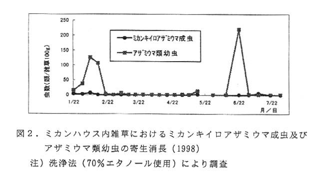 - したがって、ハウス内の雑草から、ミカンキイロアザミウマ成虫が果実へ飛来すると考えられる。なお、今回の調査において生息密度の高かった草種はスズメノカタビラである。