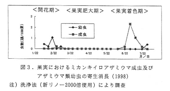 - 果実への寄生は開花期と果実の着色期頃に認められるが、幼虫数は少なくミカン果実は主要な増殖源ではない(図3)。