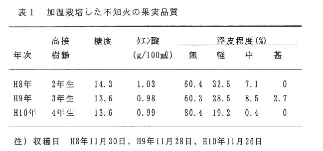 - 「不知火」の加温ハウスにおいて、1月下旬から5月下旬まで夜温15~18℃、昼温25~30℃で温度管理を行うと、11月下旬には糖度13以上、クエン酸1g/100ml以下となり、収穫できる(表1)。