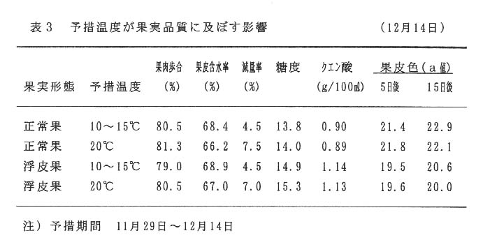 - 収穫果は裸で常温庫内(10~15℃)で減量率が約5%の予措を行うと、果皮色が優れ、品質が向上する(表3)。