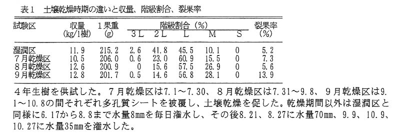 - 7月から9月にかけて土壌を湿潤に保つと1果重が大きくなり、大果率が高い。8月、9月に土壌を乾燥させると1果重は小さく、M以下の小玉果率が高くなる(表1)。