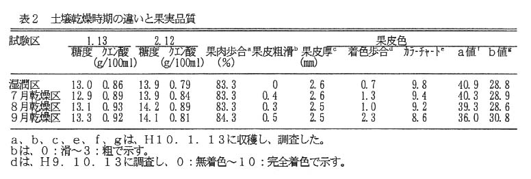 - 果皮の粗滑は、乾燥処理によりやや粗くなる傾向がみられ、果皮の着色は、9月乾燥によりいくらか早まるものの、収穫期には色差計a値及びカラーチャートによる色値が湿潤区より低くなる(表2)。